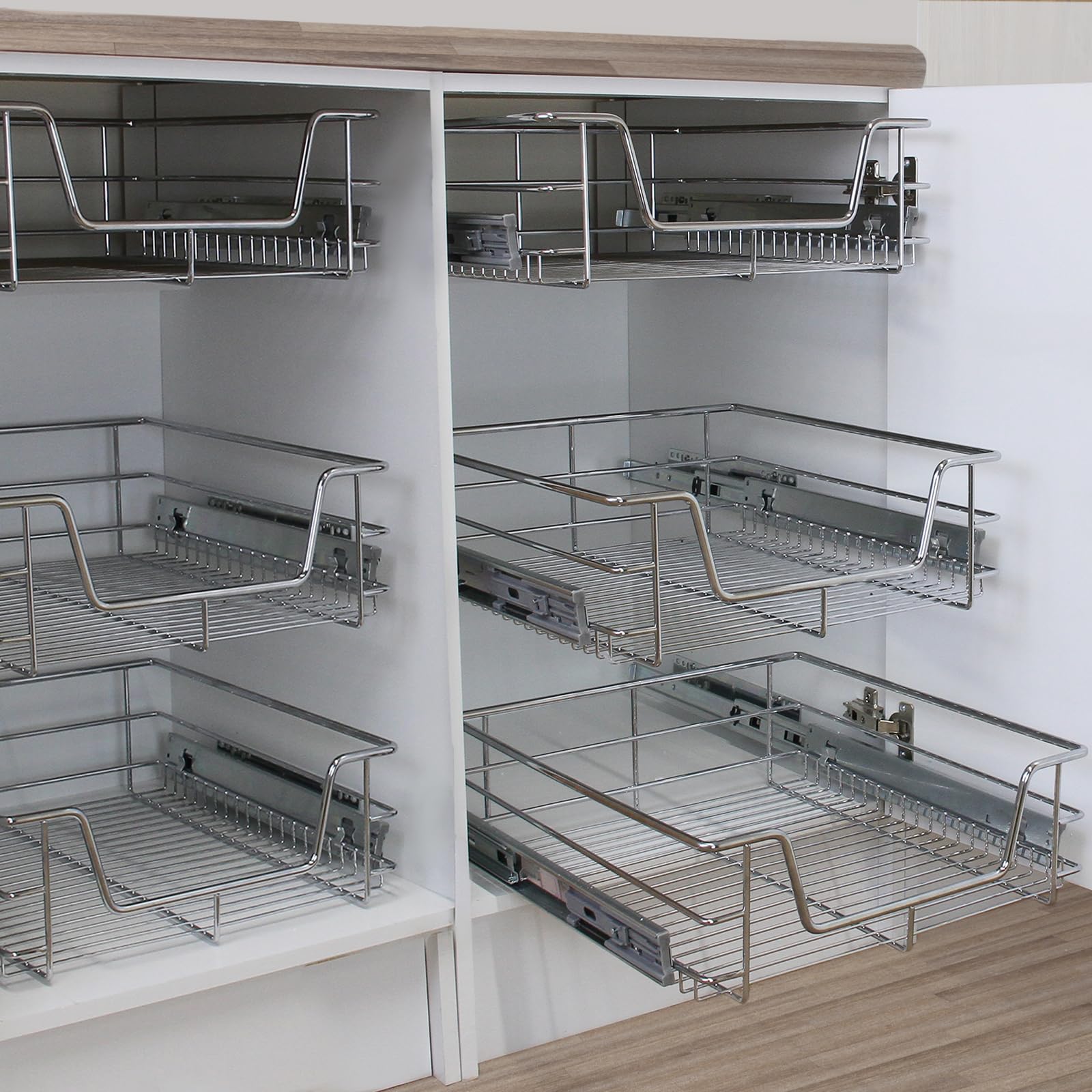 Organiza tu cocina de forma eficiente y elegante con el set de 6 cestas metálicas extraíbles Kukoo, diseñadas para muebles o armarios de cocina de 50 cm de ancho. Cada cesta cuenta con un sistema de cierre suave y guías telescópicas de cojinetes de bolas, que garantizan una apertura fluida y silenciosa, incluso con carga completa.