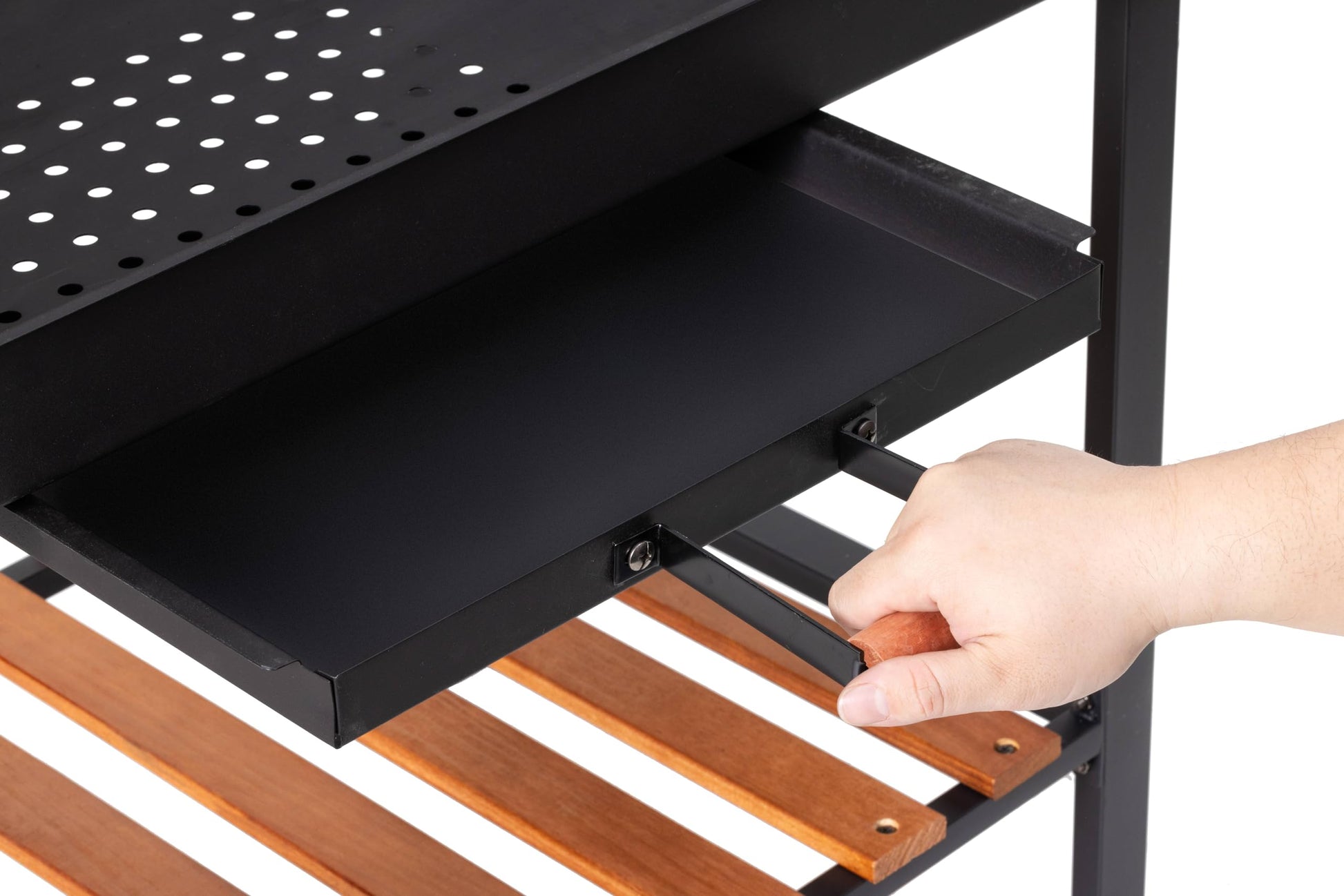 - Equipada con estantes laterales e inferiores de madera, esta barbacoa ofrece un amplio espacio de trabajo para preparar tus platos favoritos al aire libre, manteniendo todo organizado y siempre al alcance