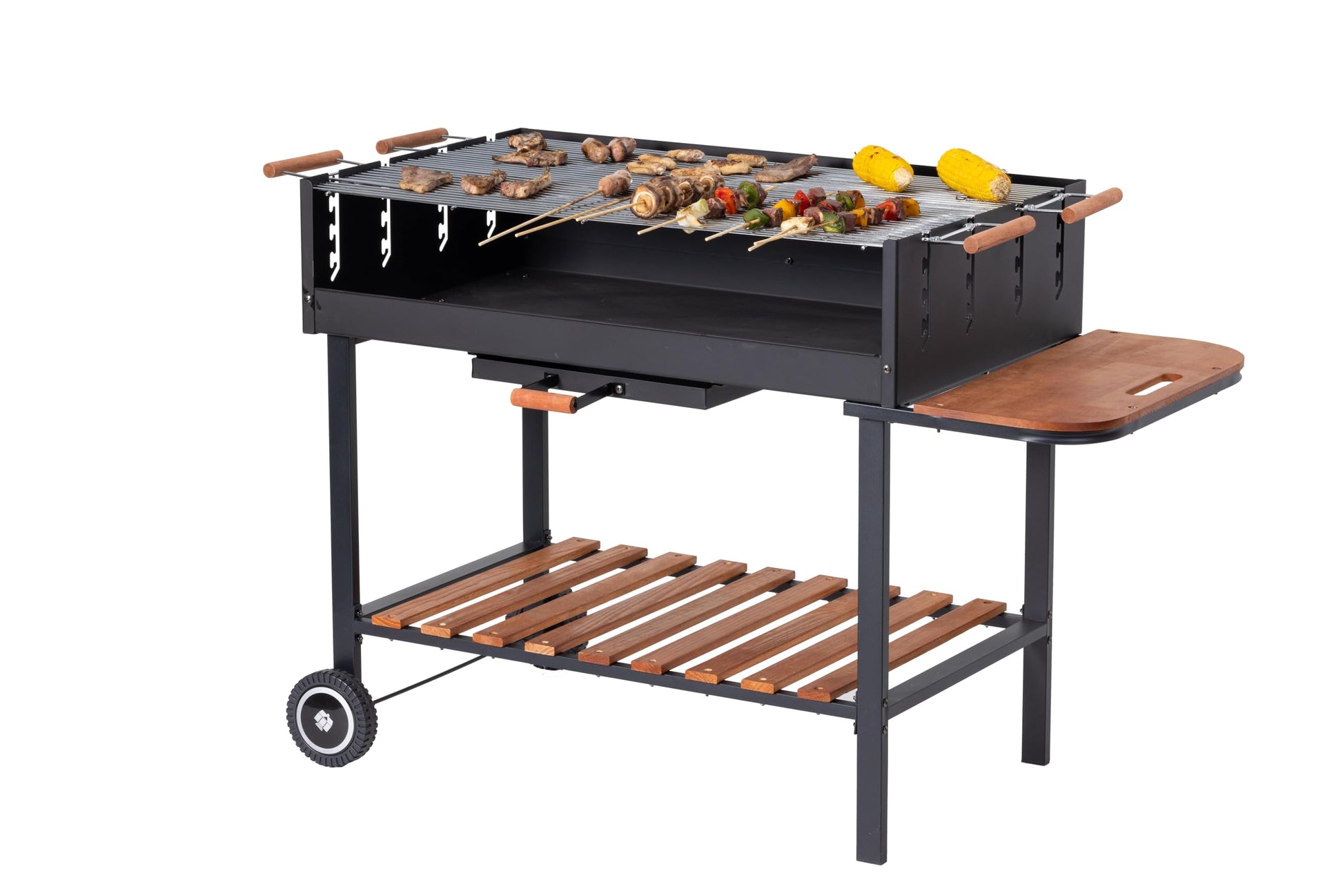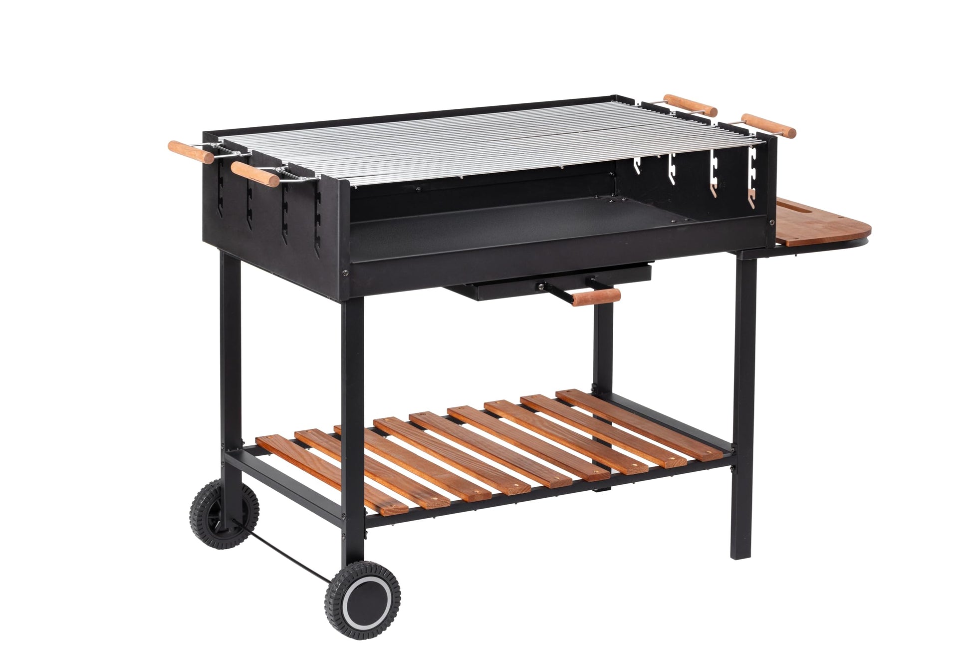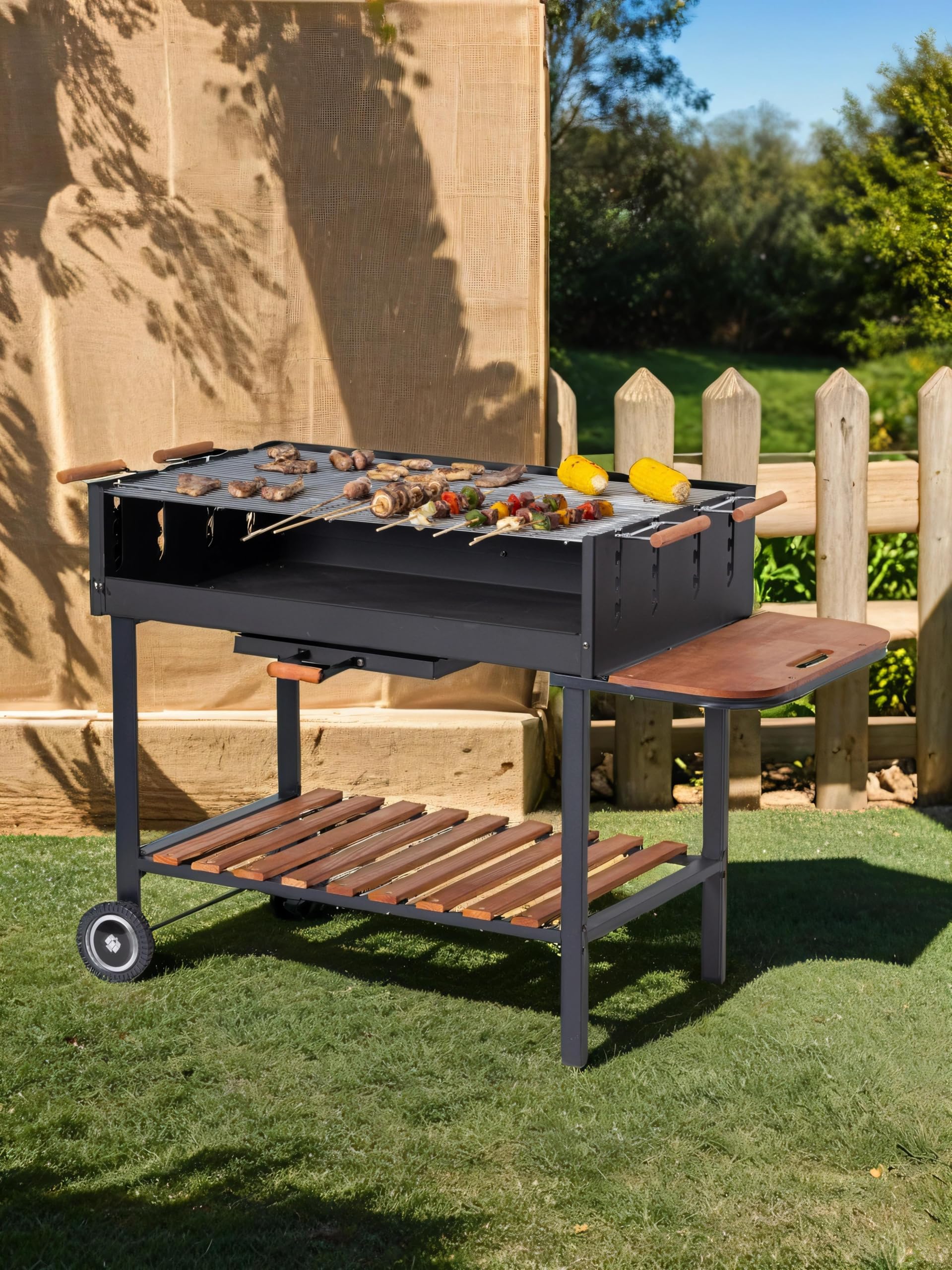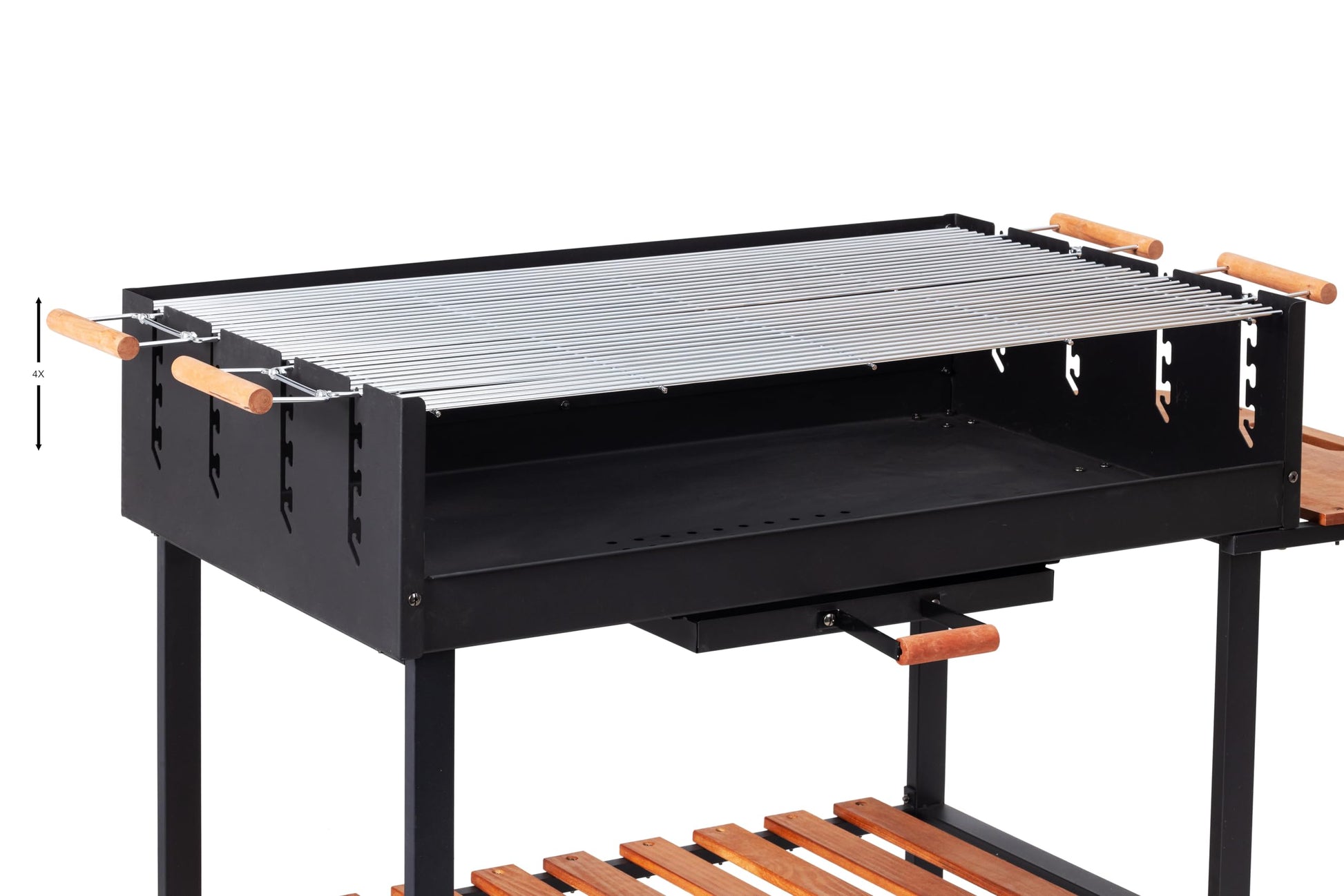 - Con una parrilla cromada ajustable y un amplio brasero de 100 cm x 60 cm, esta barbacoa permite cocinar una gran cantidad de alimentos como carne, pescado y verduras de manera uniforme y deliciosa, perfecta para reuniones familiares o con amigos